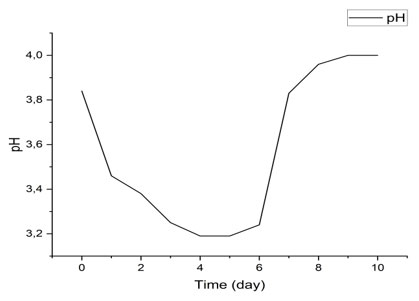 The results obtained show a progressive decrease in pH during the first days of fermentation, from 3.84 on day 0 to 3.19 on day 4, followed by a stabilization around 3.19–3.24 between days 5 and 7. An increase in pH is then observed from day 8, reaching 4 on day 10 (Figure 4).