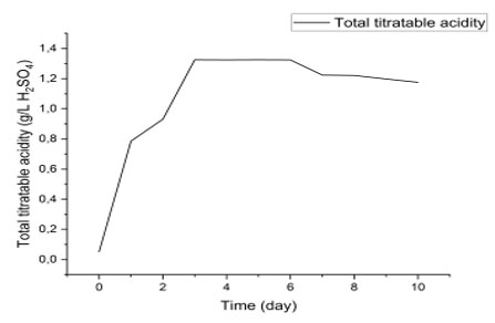 Variation of Titratable Acidity During Fermentation: Figure 5 illustrates the dynamics of total titratable acidity (expressed in g/L of H₂SO₄) over a ten-day process. A rapid increase in acidity is observed between day 0 and day 2, reaching a peak at approximately 1.2 g/L. This initial phase can be interpreted as a period of intense metabolic activity, often associated with microbial growth or primary fermentation, during which organic acids such as lactic or acetic acid are produced (Jay, Loessner, & Golden, 2005).