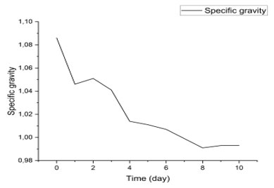 Variation in Wort Density During Fermentation: Figure 6 shows a gradual decrease in the specific gravity of a liquid, from approximately 1.08 on day 0 to 0.99 on day 10. This trend suggests a biochemical or physicochemical transformation of the medium, typical of fermentation or enzymatic degradation processes. Specific gravity is often used as an indirect indicator of the concentration of sugars or solutes dissolved in a liquid (Prajapati et al., 2014). A continuous decrease generally indicates the consumption of these substrates by microorganisms or enzymes, with the concomitant production of lighter metabolites such as ethanol, carbon dioxide, or organic acids (Steinkraus, 2004).