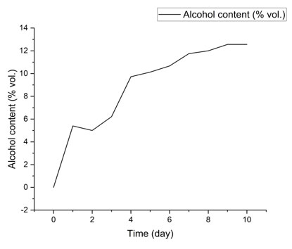The initial phase (days 0 to 3) generally corresponds to the yeasts’ adaptation to the environment, followed by an exponential phase of alcohol production (days 3 to 8), where the ethanol concentration increases rapidly. The stabilization observed around days 9 and 10 suggests that fermentable sugars have been largely consumed or that ethanol accumulation is beginning to inhibit microbial activity (Pretorius, 2000).