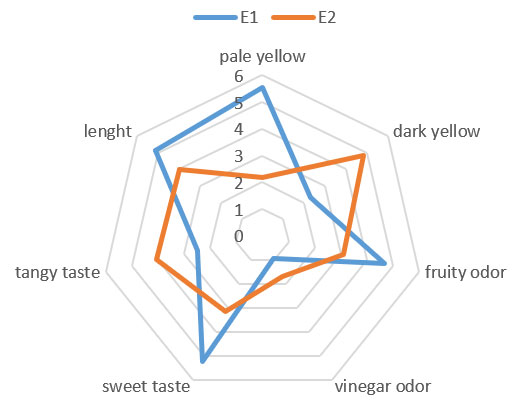 Comparative Sensory Analysis of Banana Wine: The figure presents a comparative sensory profile between two banana wine samples, E1 (blue line) and E2 (orange line), evaluated according to seven organoleptic descriptors: pale yellow, dark yellow, fruity odor, vinegar odor, sweet taste, tangy taste, and length in the mouth. Each attribute is rated on a scale of 0 to 6, reflecting the intensity perceived by a panel of tasters.